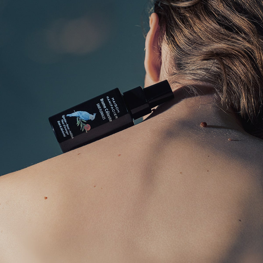 - La Brume Céleste, au parfum délicat de rose et de fleur d’oranger, redonne tonus et éclat à la peau, tout en apaisant l’esprit pour favoriser le voyage intérieur.